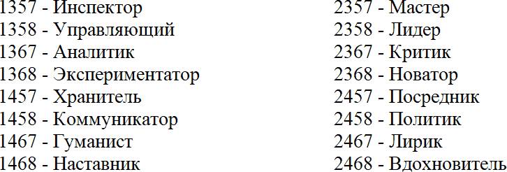 Последовательно запишите на бланке ответов номера признаков, выбранных по преимуществу положительных ответов во всех 8-и пунктах теста. В итоге получится набор из 4-х цифр. Каждому цифровому набору (коду) соответствует определенный тип личности, имеющий свое название (псевдоним). Запишите полученный цифровой код и найдите его название.
