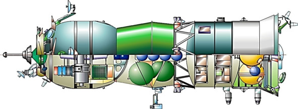 сделанный негерметичным, чтобы защитить станцию в случае утечки токсичного топлива; а также приборно-агрегатный отсек (ПАО).