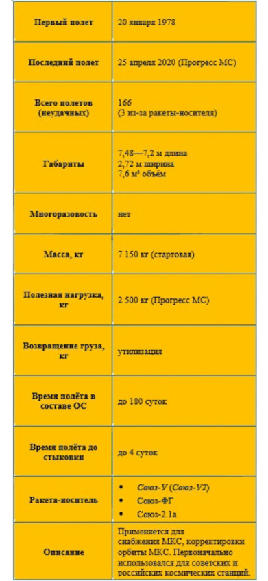 «Прогресс» – серия транспортных беспилотных грузовых космических кораблей (ТГК), выводимых на орбиту с помощью ракеты-носителя «Союз». Разработана в СССР для снабжения орбитальных станций.