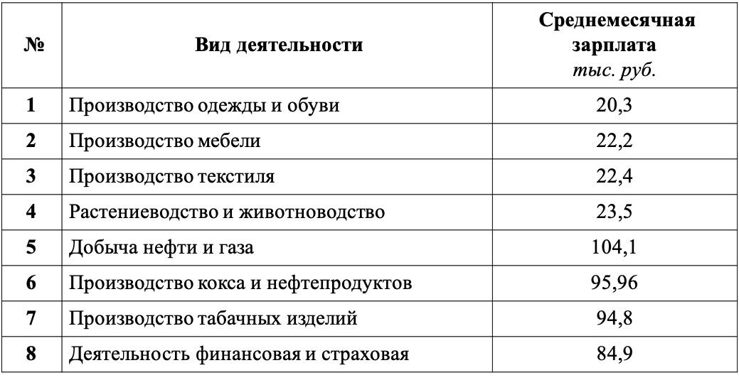 Лидерами по зарплате являются отрасли (5–8), добывающие и перерабатывающие нефть и газ, банковская сфера. К ним, несмотря на свою негативное влияние на наше здоровье, вплотную приблизилась табачная отрасль. В указанных отраслях очень высок уровень монополизации. При этом государство является главным собственником отраслей поз. 5,6,8.