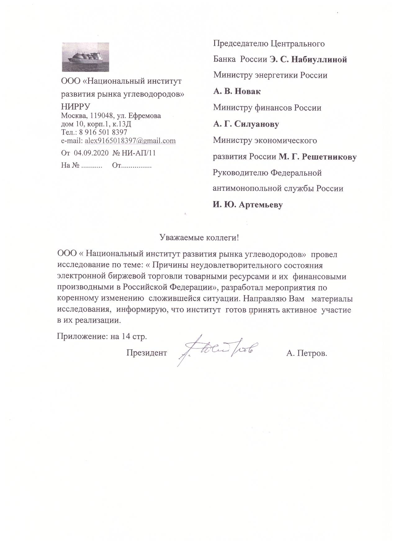 3.5.2 Письмо в ведомства, отвечающие за развитие биржевой торговли.