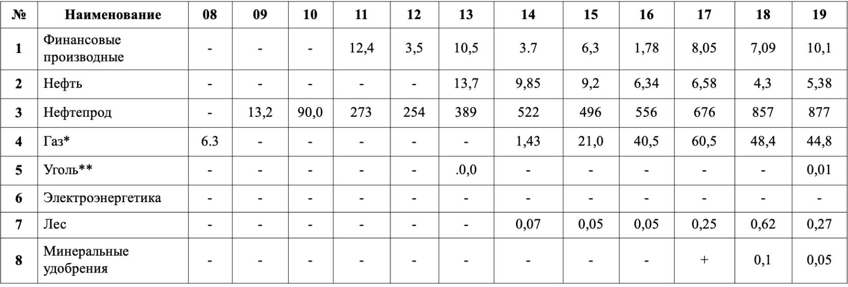 Таблица 1. Объемы биржевых торгов за период 2008 – 2019 годы, млрд. руб.