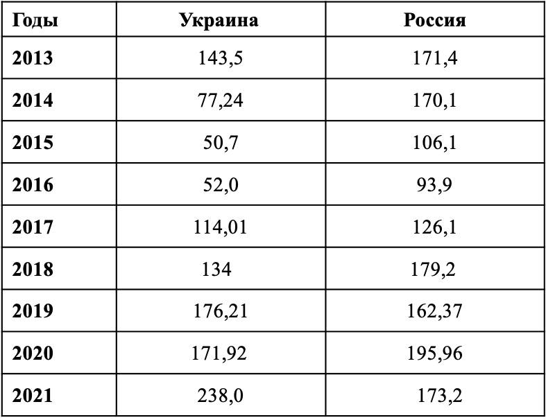 Таблица 4. Динамика изменения МРОТ России и Украины за 2013 – 2022 годы, (долл. / мес.)