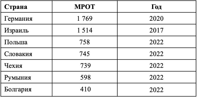 Таблица 5. Данные по МРОТ в странах ЕС, (долл.)