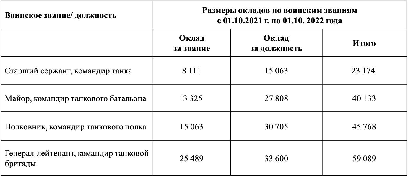 Изучение данных на сайте Минобороны России показывает, насколько эта проблема актуальна. По данным 2019 года, средняя зарплата в ВС России составила 43 500 руб./месяц. Приведу выдержки с сайта Минобороны по наиболее значимым категориям военнослужащих.