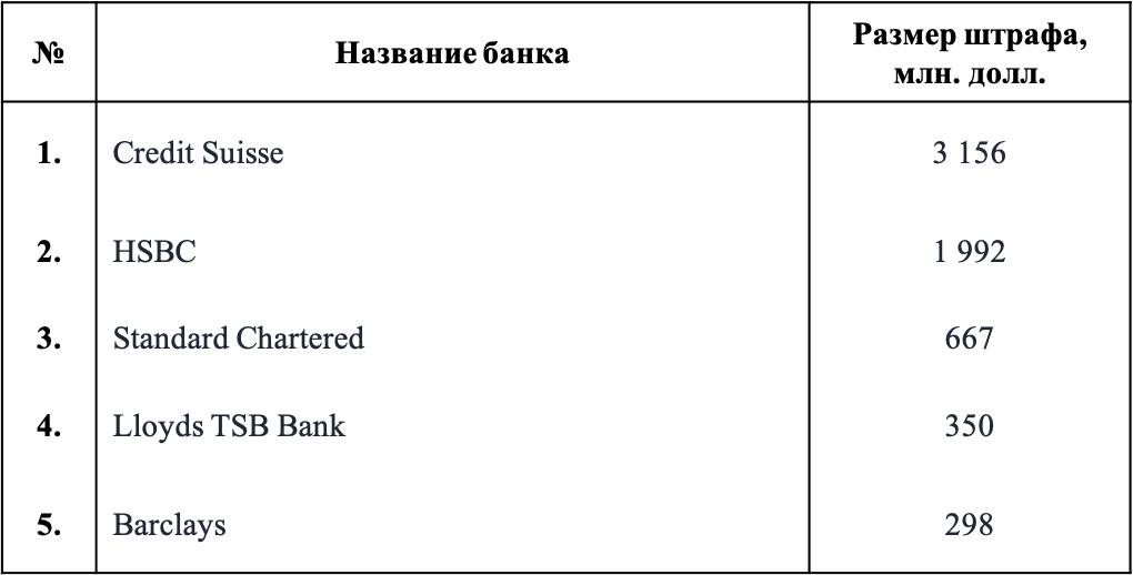 Таблица 7. Крупнейшие штрафы Минюста США по европейским банкам за период с 2009 года.