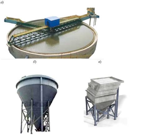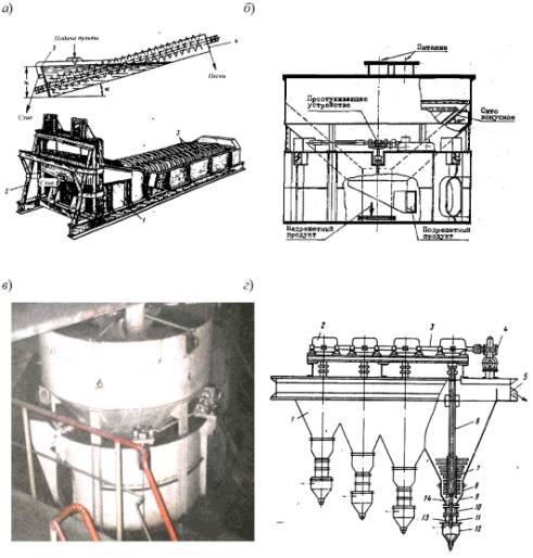 в – цилиндроконический сгуститель; г – гидравлический камерный классификатор