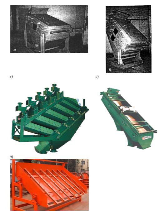в – репульпирующий грохот Деррика; г – грохот Stack SizerTM; д – типа ZGP-S