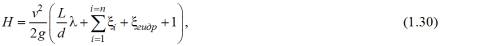 где – скорость течения жидкости в трубопроводе, м/сек; – длина трубопровода, м; – диаметр сечения трубы, м; – коэффициент сопротивления трения единицы относительной длины трубы; – местные коэффициенты сопротивления (вход в трубопровод, задвижки, повороты трубопровода); – коэффициент сопротивления гидроциклона; – ускорение силы тяжести, м/сек2.