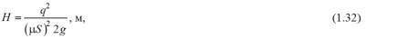 где q – секундный расход, м3/сек.; µ- коэффициент расхода; – сечение выходного отверстия, м2; g– ускорение силы тяжести, м/сек.