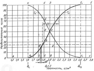Вероятное отклонение кривой разделения определяется как полуразность между абсциссами (плотностями) точек кривой, соответствующими ординатам (разделительным числам) 25 и 75: