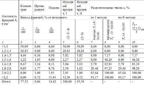 По второму методу разделительные числа для промпродукта рассчитываются как частное от деления суммарного количества определенных фракций в промпродукте и породе к количеству этих же фракций в исходном угле: