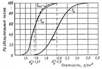 Если теперь на оси абсцисс отложить в масштабе среднее значение плотности фракций, а на оси ординат – разделительные числа, то получим кривые разделения для концентрата Тк и породы Тп (рис. 1.27). Эти кривые симметричны и пересекаются в точке, ордината которой соответствует разделительному числу 50 %. Абсцисс точки пересечения соответствует плотности разделения.