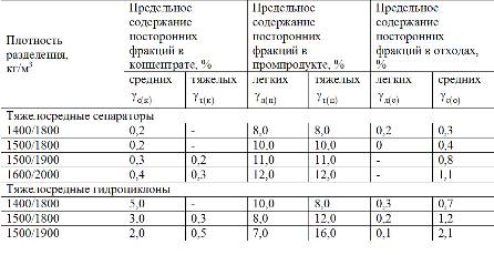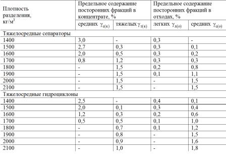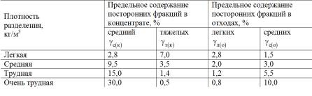Нормативы предельного содержания посторонних фракций в продуктах обогащения при обогащении в тяжелых средах с выделением двух продуктов