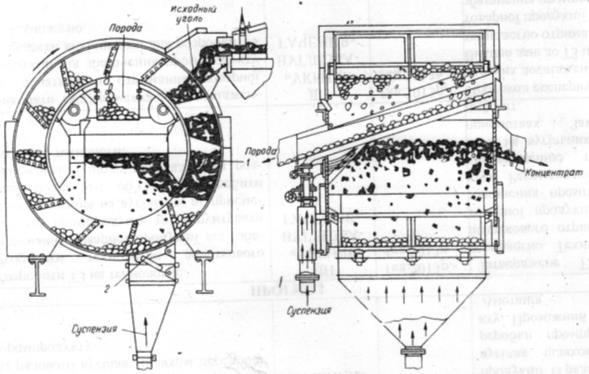 Барабанные тяжелосредные сепараторы, применяемые для обогащения угля, подразделяются на два типа: барабанные сепараторы с неподвижным цилиндрическим кожухом и элеваторными колесами для удаления продуктов обогащения и вращающиеся барабанные сепараторы.