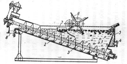 Погрузившийся продукт поднимается вдоль по лотку винтовым конвейером и выгружается через люк 8 немного выше уровня суспензии в ванне.