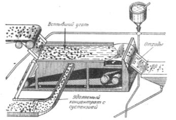 Рядовой уголь и суспензия загружаются в сепаратор с глубокой стороны и движутся со скоростью 2–3 м/мин к противоположной, мелкой стороне. Суспензия подается насосом через расположенный у вертикальной стороны аппарата распределительный карман, отделенный от ванны листом с отверстиями. Всплывший продукт движется вместе с потоком и подается лопатой специальной конструкции в желоб, расположенный по всей ширине аппарата под поверхностью суспензии. Механическая лопата подвешена на валу, который вращается в подшипниках, расположенных над ванной. Из желоба продукт выдается на дренажный грохот.