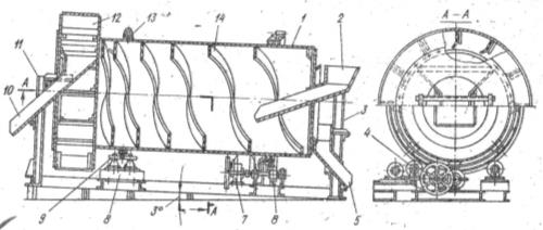 1 – барабан; 2, 3 – загрузочный желоб и стойка его крепления; 4 – опорный ролик; 5 – желоб всплывшего продукта; 6 – привод барабана; 7 – редуктор привода; 8 – рама; 9 – упорный ролик; 10 – желоб потонувшего продукта; 11 – стойка крепления желоба; 12 – лопастный элеватор; 13 – реборда качения; 14 – спиральная решетчатая лопасть