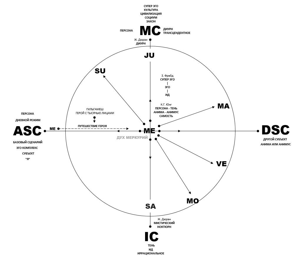 На данной схеме верхняя точка соответствует Социальному Логосу и обозначена как MC. Это общепринятое название для 10-го дома гороскопа (Medium Coeli – Середина неба), который является наивысшей точкой всей карты. Классические описания этого дома достаточно отчетливо коррелируют с теми аспектами коллективного сознательного, о которых речь шла выше: это территория социума, закона, культуры и цивилизации вообще. Этот дом непосредственно формирует архетип Персоны, определяя социальные роли и маски, которые проявляются в точке ASC, т.е. классического 1-го дома гороскопа, основной сигнификацией которого является “Я”, эго-комплекс. Нижняя точка, обозначенная IC (Immum Coeli – Дно неба), представляет собой “подвал” карты, территорию иррационального и бессознательного, а также архетипа Тени. DSC же, 7-й дом представляет собой архетип Анимы/Анимуса. Планетарные же архетипы “по умолчанию” будут тяготеть к той или иной оси: Юпитер и Солнце связаны с Социальным Логосом, Солнце также сигнифицирует 1-й дом, сознание, поэтому расположено между 1-м и 10-м, Сатурн находится на “дне”, символизируя темные аспекты человеческой личности. Там же находится Луна. Венера и Марс в данной системе координат будут связаны с архетипом Анимы/Анимуса. Меркурий – психопомп – обозначенный маленьким me представляет изначальный эго-комплекс, а большой Me расположен в центре, символизируя процесс индивидуации и обретения самости путем интеграции архетипов. Необходимо отметить, что положения планет здесь носят именно изначальный характер “по умолчанию”, но способны при этом перемещаться по осям, подчеркивая амбивалентность архетипа; сложный астрологический инструментарий во многом и разработан для определения “положения” планеты в этой системе координат.