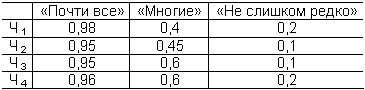 Значит, все зависит от того, как определены β, γ и ω. Пусть для определения этих значений мы опросили четырех людей Ч1, Ч2, Ч3 и Ч4. Их ответы сведены в табл. 6.