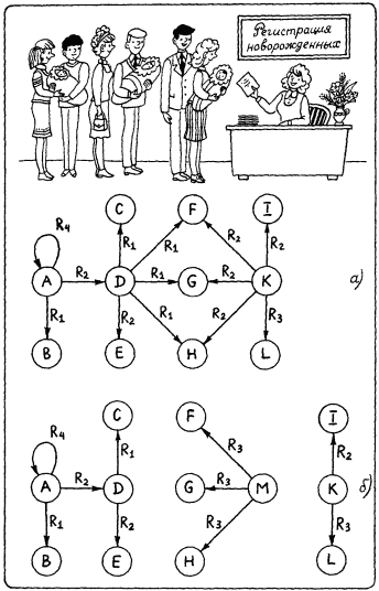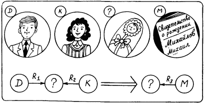 На рис. 34 показана такая продукция. Знак вопроса означает, что в качестве имени вершины может выступать любое из тех, которые имеются в базе знаний. Но если знак вопроса заменен какой-то вершиной, то в правой части продукции появляется такое же имя. Исходное состояние базы знаний показано на рис. 35, а. Для облегчения дальнейших рассуждений будем считать, что вершины семантической сети соответствуют некоторым персонажам, отношение R1 имеет смысл «быть отцом», отношение R2 – «быть матерью», а отношение R3 – «носить фамилию». Тогда продукция, показанная на рис. 34, может интерпретироваться следующим образом: «Если в базе знаний есть сведения о детях, для которых D является отцом, а К – матерью, то эту информацию из базы надо убрать, добавив в нее информацию о том, что все эти дети носят фамилию М».