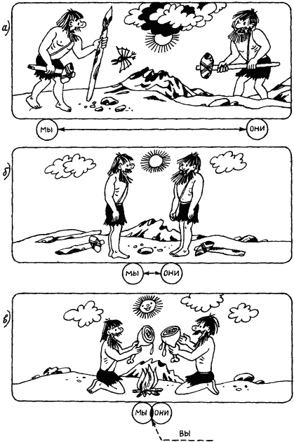 Когда относительно недавно состоялся первый контакт маленькой группы людей, живших на одном из Андоманских островов, с представителями современного человечества, то ни те, ни другие не сомневались, что перед ними существа, близкие им. Это был контакт различных культур, но это был контакт людей. Наступает момент, когда МЫ и ОНИ начинают контактировать, и тогда возникают ВЫ, которые еще МЫ, но уже не ОНИ (рис. 1, в). ВЫ характеризуют динамику, переход ИХ в НАС. Это может быть приход жены из другого племени или превращение ребенка во взрослого после обряда посвящения (инициации). Но ВЫ может характеризовать и обратный переход от НАС к НИМ: изгнание из племени, уход женщины племени к мужу в другое племя и т.д.
