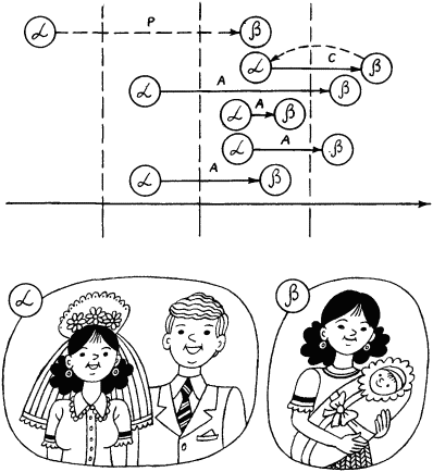 Схемы рассуждений типа «Если α, то β», принадлежащие трем различным ипостасям человека, можно сопоставить со схемой, показанной на рис. 3. Из этой схемы видно, что на уровне Р посылки α находятся где-то в прошлом, а заключение β присутствует в настоящем. Это прошлое может быть столь далеким, что α просто забыты, и реализуется редуцированное правило вывода, утверждающее, что имеет место β. На уровне С β находится в будущем. Это очень желаемая цель, а наличие α постулируется в настоящем, оправдываемое желанием β. Наконец, на уровне А действует обычная схема, в которой и посылки, и заключение реализуются в настоящем, либо посылки и заключения отнесены к различным временам, но верность этих посылок и верность связи между α и β субъект четко и критически осознает в настоящее время.