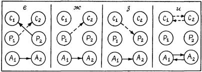 В конце этого раздела упомянем еще об одном виде трансакций – скрытых трансакциях. Примеры таких трансакций приведены на рис. 6. При скрытых трансакциях вербализуется одна связь, но истинная связь скрывается за этой внешней оболочкой. Приведем два диалога, иллюстрирующие схемы, показанные на рис. 6. Как и ранее, сами диалоги помечены теми же буквами, что и схемы на рисунке.