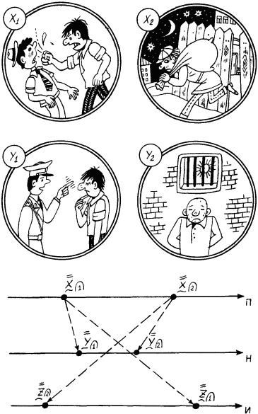 Приведем в качестве примера три шкалы, показанные на рис. 7. Первая является шкалой тяжести уголовных преступлений. Чем правее лежит точка на этой шкале, тем более тяжелым считается преступление. На второй шкале отмечены сроки наказания, назначаемые за совершенные преступления, а на третьей шкале в некоторых условных единицах отмечены оценки способности заключенного к полному исправлению после наказания. Эти три шкалы на рисунке соответственно обозначены буквами П, Н и И. Пусть уголовный кодекс некоторой страны предписывает за преступление х1 применять наказание у1. И пусть ситуация (x1,y1) дает оценку шанса на исправление z1. Тогда если преступление х2 более серьезно, чем преступление х1 (например, x1 соответствует драке, a x2 – краже), то естественно ожидать, что наказание за кражу должно быть большим y1, а z2 должно быть меньшим, чем z1, или в крайнем случае совпадать с ним.