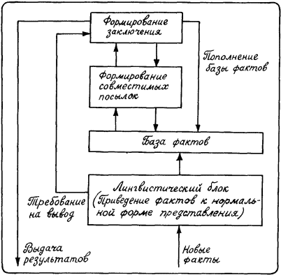 На рис. 18 показана общая структура системы, позволяющей получать силлогистические выводы. Четыре блока системы выполняют следующие функции. Новые факты, поступающие в систему, попадают в лингвистический блок, который преобразует их в нормальную форму. Если вспомнить первоначальную форму посылок в сорите о ростовщиках и любителях выпить, то становится понятным, что работа лингвистического блока не столь проста. В его задачу входит не только «навешивание» кванторов «всякий» и «некоторые», но и вычленение имен классов сущностей, а также освобождение высказываний от тех слов, которые не влияют на суть той информации, которая в высказывании содержится. Лингвистический блок должен определить, говорит ли высказывание о некоторой единичной сущности или о совокупности таких сущностей.