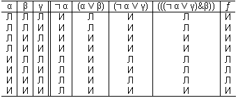 Появление в пятой строке в столбце ƒ значения Л свидетельствует о невыводимости исследуемой формулы. На этом шаге процесс вывода можно прекратить. Остальные строки в таблице приведены лишь для полноты картины.