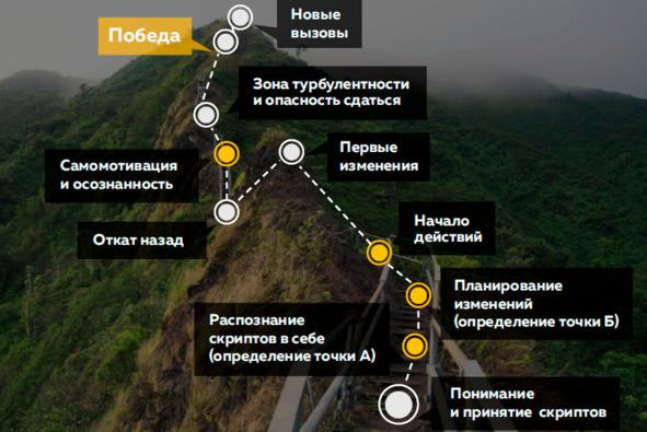 A. Понимание и принятие факта существования скриптов.B. Распознание скриптов в себе (определение начальной точки А).C. Планирование конкретных желаемых изменений, выявление ненужных скриптов (целеполагание и верификация целей – определение конечной точки Б).D. Начало действий по изменению скрипта (этап перехода).E. Первые успехи.F. Откат назад, прокрастинация.G. Самомотивация и тренировка осознанности.H. Зона турбулентности и опасность сдаться.I. ПобедаJ. Новая неудовлетворённость уже наработанными скриптами и новые вызовы.