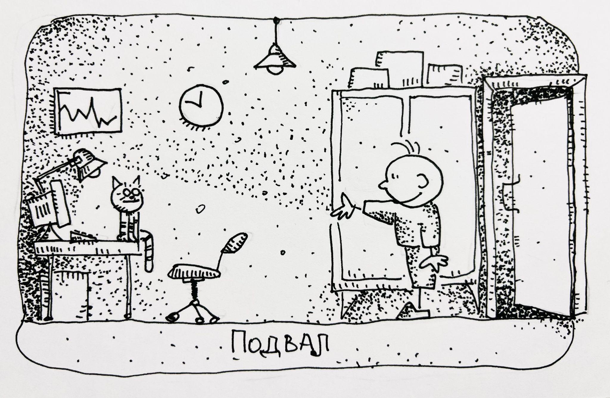 Снизу донеслось мяуканье. Кирюша обернулся. Котенок, а по звуку это был именно котенок, мяукнул еще раз, словно звал, может быть, на помощь. Этого достаточно, чтобы стать важным. Кирюша спустился по ступенькам и приоткрыл дверь, за которой влево и вправо убегал коридор подвала. Мальчик остановился и прислушился. Снова раздался зов котенка, и Кирюша осторожно пошел направо в полутьму коридора меж череды дверей по обе стороны.