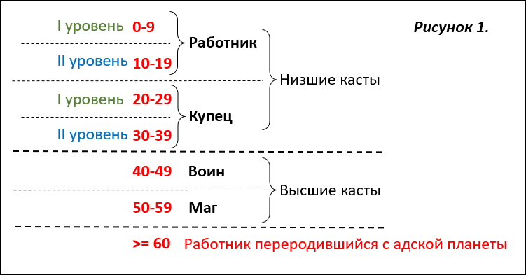 Дух развивается поэтапно, плавно переходя от одного состояния в другое. Та цифра, что в итоге получилась, показывает количественное значение уровня развития Духа. Чем он выше, тем больше у человека благостных качеств, тем сильнее у него тяга помочь людям, учить их, просвещать. От жизни к жизни, дух развивается, и каждая новая жизнь в любом случае будет либо на том же уровне, что предыдущая, либо уровнем выше. Кроме последней стадии, о ней чуть позже. Немного о предназначении и качествах, свойствах личности каждого уровня развития духа. Иначе говоря, о кастах поподробнее…
