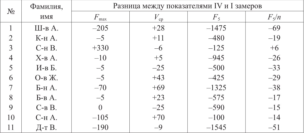 Иллюстрацией вышеизложенного служит индивидуальная динамика показателей ударов (табл. 6) к концу сбора. Результаты, представленные в таблице, говорят о том, что у всех боксеров, кроме одного, (№ 3, С-н В.) произошло ухудшение силовых показателей ударов. Показатель средней скорости удара (Vср ) у большинства боксеров увеличился, но статистически недостоверно.