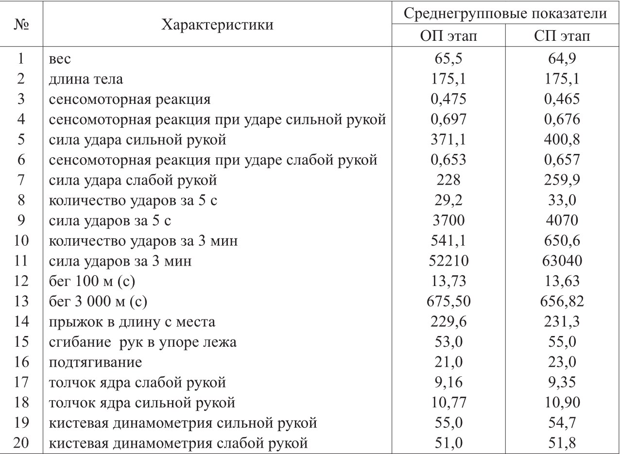 К исследованиям привлекались 16–17-летние боксеры – члены сборной молодежной команды страны по боксу в период их подготовки к соревнованиям и участия в них (всего 28 чел.). Квалификация боксеров – МС и КМС, стаж занятий боксом от 3 до 5 лет. После завершения каждого из рассматриваемых этапов подготовки боксеры-юниоры участвовали в соревнованиях республиканского и международного рангов, в которых проводили 3–4 боя. Так, после общеподготовительного этапа боксеры России участвовали в международном турнире, а по окончании специально-подготовительного – в первенстве Европы среди юниоров, где завоевали общекомандное 1-е место.