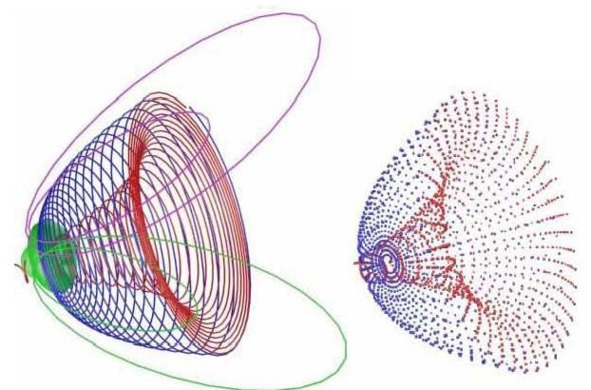 Фото 8. Схема волноводов из зерен-потенциалов электронов. Синие электрические, красные гравитационные. Справа продукты производства магнитного монополя электрона – его мгновенный фантом-поле из зёрен-потенциалов