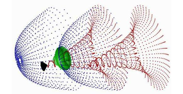 Итак, разряжаясь из центральной точки расположения зелёной сферы, гравитационный монополь с полуцелым спином переходит в электромагнитный микровихрон, т.е. создаёт волновод из зёрен-гравпотенциалов, воспроизводит волновод из отрицательных электропотенциалов, который регенерирует-заряжает первичный магнитный монополь с тем же знаком.