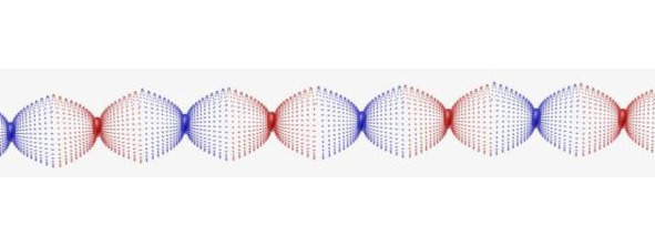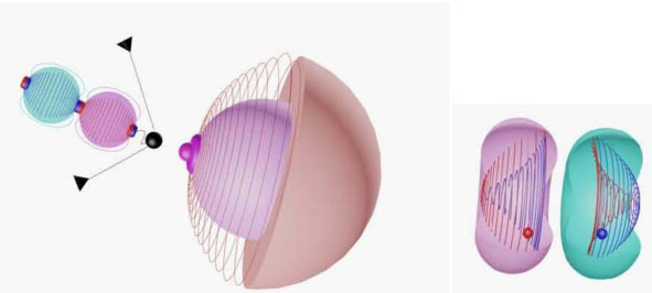 – вначале фазового объёма фотона уменьшающийся по величине максимальный по заряду магнитный монополь, разряжаясь, индуктирует противодействующий его уменьшению электрический монополь и производит волновод из зёрен-электропотенциалов, вращаясь по спиралям увеличивающегося диаметра, 128