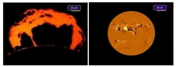 Высокоэнергетический гигантский солнечный макровихрон специфически взаимодействует с плазмой Солнца – в момент его выхода через поверхность фотосферы его электромонополь захватывает кластер фотосферы, который через мгновение будет выброшен исчезающим электромонополем из его фазового объёма, и образует в фотосфере пару брешь – «чёрное пятно» и белое пятно над ним. Такие заряды замечены (фото 2.7) на поверхности Солнца – назовём их «» фотонами. 120 сверхтяжёлыми