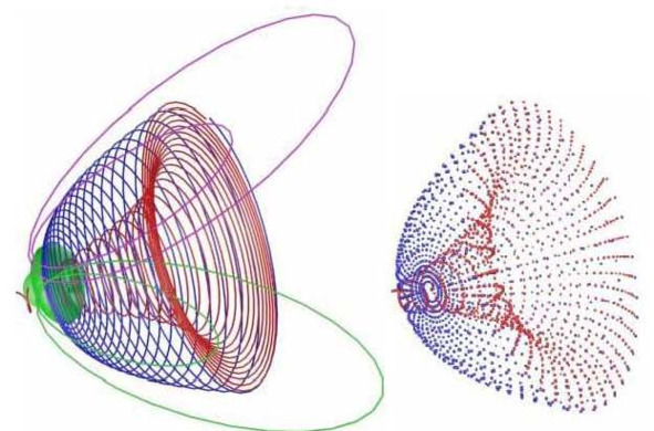 Для наглядности проиллюстрируем сказанное графическими схемами фазового объёма электрона и позитрона, его возможных состояний. На Фото 2.5 приведены схемы рождения электрона и позитрона, его электрических потенциалов-зерен на волноводах и магнитного поля. Структура размещения гравитационных потенциалов в сфере гравитационного монополя заполняется в полной аналогии, как и в сфере магнитного монополя. Производство внешнего поля электрического заряда электрона производится обновлением контура волновода из электрических зёрен-потенциалов магнитным монополем, при котором старый волновод отбрасывается в пространство. Этот процесс происходит с частотой 10Гц и рождает внешнее электрическое поле электрона. Таким же образом происходит создание его внешнего гравитационного поля, которое взаимодействуя с полем тяготения Земли, проявляет у электрона свойства заряда массы. 20