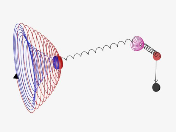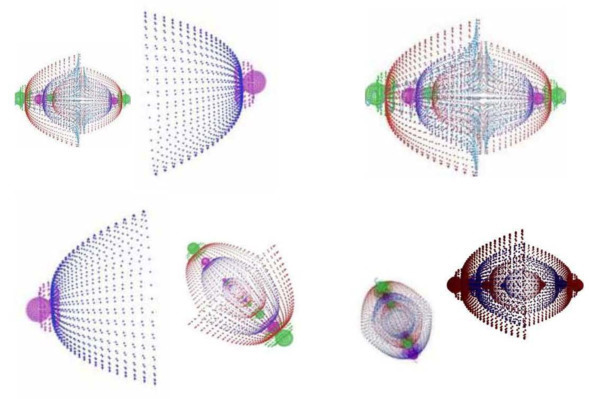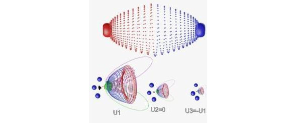 Фото 2.24. Излучаемый фотон в состоянии активной фазы движения и перезарядки магнитного монополя на полволне волновода развернутого электрического вихревого поля из электропотенциалов с локальными значениями в фотоне U1, U2=0 и U3= – U1. Внизу входящий электрон в фотон, ускоряемый им до мюона и тау-лептона. Синии шарики вокруг ГЭММ частиц – это индуктируемые вокруг них движением магнитные монополи микровихронов.