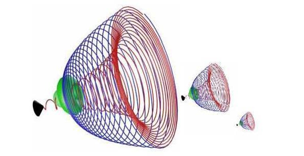 Поэтому распад мюонов (фото 2.22) происходит через промежуточное состояние с полуцелым спином. Мюоны при распаде превращаются в соответствующие по знаку частицу – электрон или позитрон с сопровождением вылета двух соответствующих нейтрино. В соответствии с уменьшением внутренней энергии, у образовавшейся промежуточной частицы увеличивается радиус полусферы волновода её фазового микропространства. «Замороженные» спиральные волноводы бывшего мюона уже без вихрона становятся мюонным нейтрино (антинейтрино) – по крайней мере, на время распада их можно считать компактифицированными частицами, которые, отбирая соответствующую долю кинетической энергии, покидают место распада. Новая промежуточная частица нестабильна и распадается, её вихрон покидает созданное фазовое пространство, которое превращается в электронное антинейтрино (нейтрино). Вылетевший в электрическое поле частицы промежуточного состояния запертый магнитный монополь формирует уже резонансно-стабильное фазовое пространство электрона (или позитрона), отдавая излишнюю энергию в кинетической форме электронному антинейтрино (нейтрино).