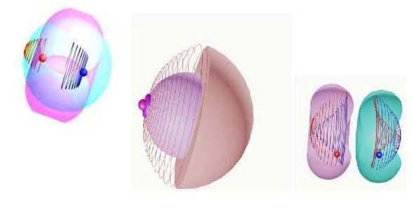 Фотоатомные реакции. Свойства различных микровихронов образовывать те или иные микрочастицы, прежде всего, зависят от промежутка времени и скорости изменения полей, породивших их, а уж потом от условий полей пространства, через которые они проходят. Внешние свойства вихронов также зависят от длины волны, как свойства радиоволн отличаются от свойств световых фотонов, рентгеновских лучей и гамма-квантов. Основной процесс приводящий к взаимодействию свободных электромагнитных микровихронов с веществом или полем заключается в торможении их магнитного заряда при разрядке путём захвата собственного электромонополя внешним электрическим полем ядра, атома или электрона или другого электрического поля пространства, с образованием промежуточного состояния, при котором магнитный заряд совершает высокочастотный квантовый переход в гравитационный монополь. В результате часть или вся энергия магнитного заряда распределяется между электро или гравпотенциалами соответствующих волноводов. Так, например, при энергии налетающего на атом фотона гамма-излучения выше пороговой в 1022 Кэв электромонополь его свободного микровихрона тормозит до полной остановки движение магнитного монополя, взаимодействуя с полем атомного ядра. При этом происходит его деление на два самостоятельных, но замкнутых и покоящихся вихронов, в фазовом объёме которых уже рождаются гравитационные монополи – носители индуктированной энергии в состоянии относительного покоя. На фото 4 приведена схема деления свободного вихрона таких фотонов на два разнополярных (красный и синий).