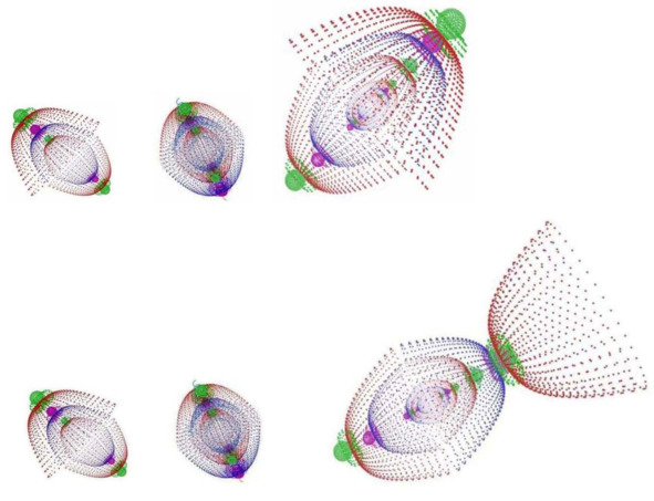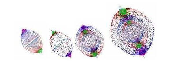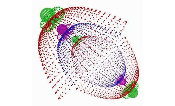 Ядерные замкнутые вихроны рождают три вложенных друг в друга оболочки со структурой нейтральных мезонов – три ядерные оболочки (фото 9), составленные из противоположных по знаку электрического заряда частиц со структурой типа мюонов – сложная центральная интеграция материи-контуров в состоянии покоя. Это основное свойство гравиэлектромагнитных диполей высоких резонансных частот.