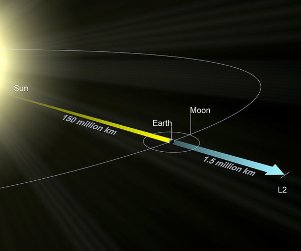 Месторасположение космической обсерватории Gaia относительно Солнца, Земли и Луны находится в точке L2.