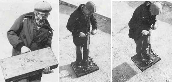 Гравитолёт В. С. Гребенникова выглядит очень простым – стойка с двумя рукоятками, установленная на раскрытых крышках складного чемоданчика – днище, опора для ног человека.
