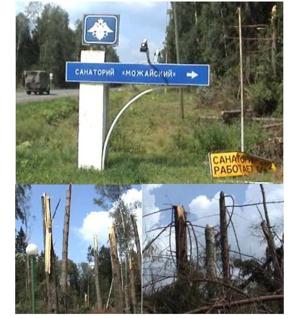 Зарядившись восходящими потоками паров воды из Можайского водохранилища в ночь на 13—14 июля 2016 года, ураган превратился в торнадо, ядро (гравитационный монополь) которого опустилось к поверхности земли. Первый разряд ядра торнадо пришёлся на пересечение с дорогой на Можайский санаторий. Гуляющими поперечными вихревыми токами разряда срубило более 100 деревьев посередине их стволов, а также вырвало из монтажной коробки электрической цепи 220 вольт включения подорожных фонарей освещения преобразователь (фото 3.7) питания лампы в составе – трансформатор и немецкий конденсатор E01/C70—301000 10 микрофарад, 250в, 50/60 Hz. На фото 3.7 показано – общий вид блока со сторон трансформатора и конденсатора на другой стороне блока, и характерная степень разрушения внешней пластмассовой оболочки корпуса конденсатора.