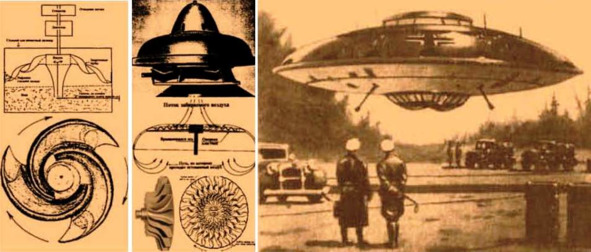 Испытания в Германии показали, что маленькая «имплозионная»94 машина диаметром 20 см с вращающимся в ней потоком рабочего тела по специальным сверхтекучим волноводам со скоростью 10000 оборотов в минуту может поднять 57 тонн, а при 20000 оборотах в минуту – 228 тонн массы.