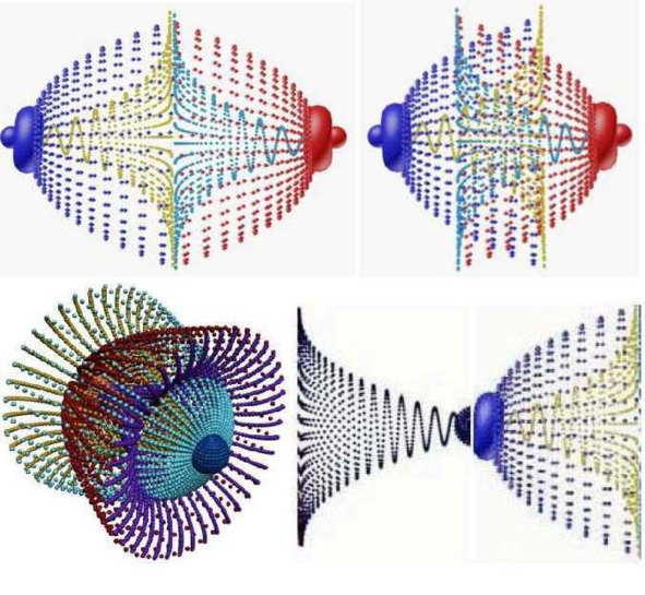 Фото 5.2.6а. Слева вверху ГЭМД, продольные и поперечные пульсации с расходом энергии, последний внизу иллюстрирует процессы выброса, движения и разрядки гравитационного монополя до его полного исчезновения.